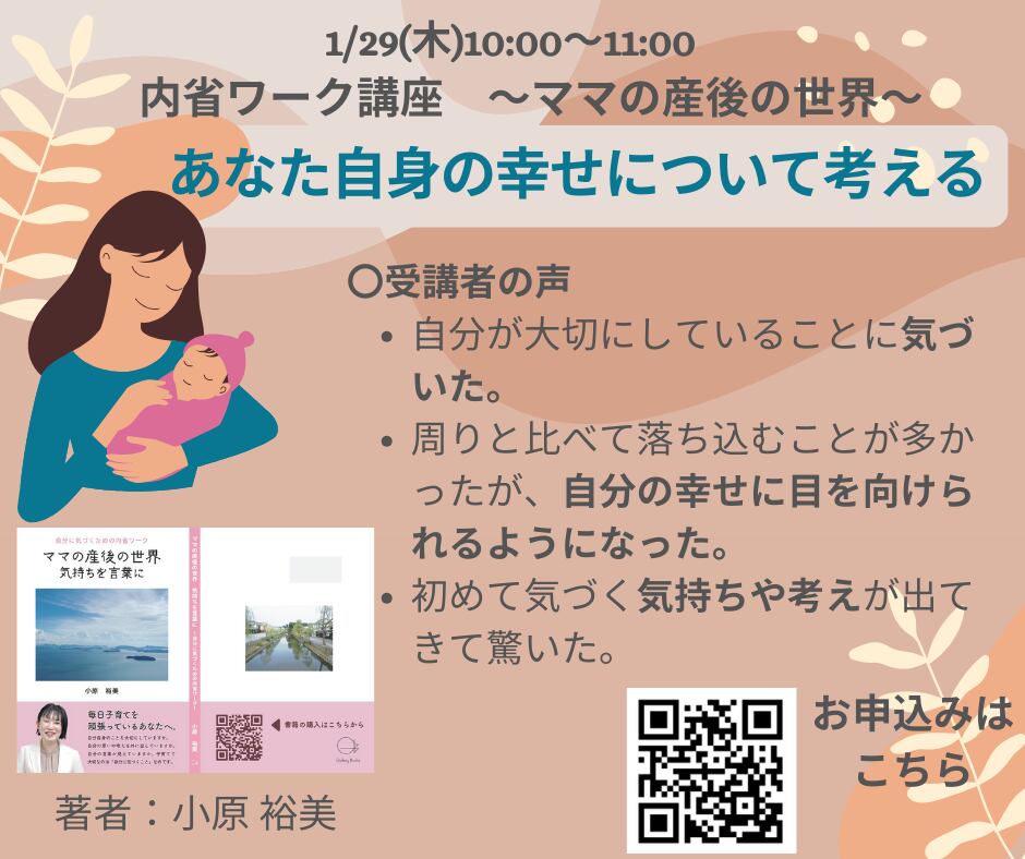 今回の講座では、書籍『ママの産後の世界 気持ちを言葉に』の中にあるワークをひとつ取り上げ、ゆったりと“自分自身の幸せ”について考える時間をつくります。